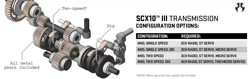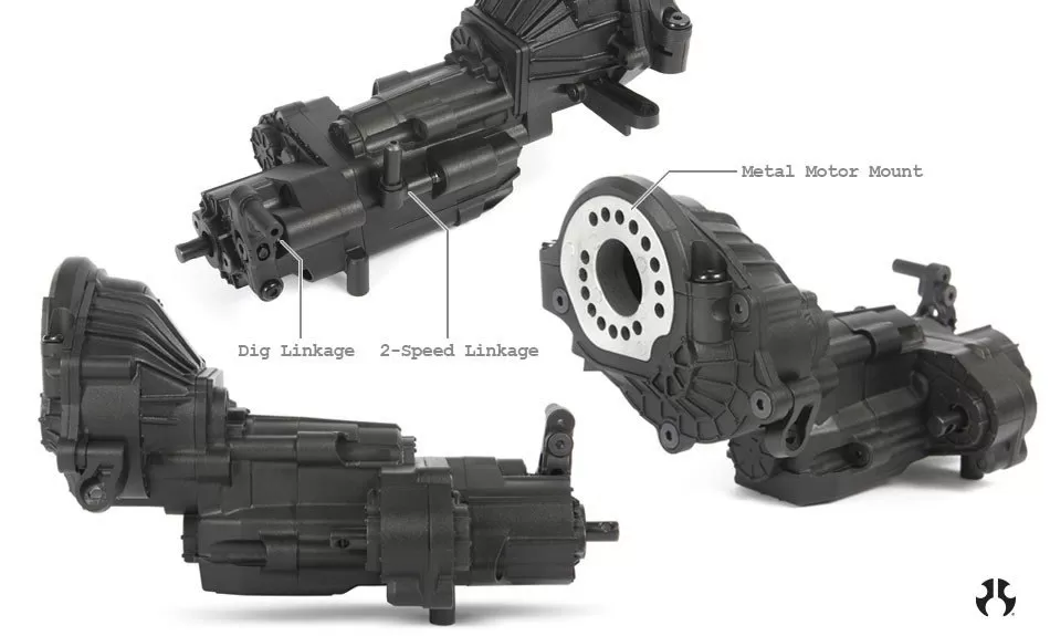 The transmission arrives set up with a DIG function for locking the rear axle from the transmitter, giving you the tight turning radius of front wheel drive on demand – Micro Dig Servo (SPMSSX107) included! You can also choose to set up the vehicle for a two-speed transmission instead, by taking the included Micro Dig Servo and moving it to the two-speed linkage.