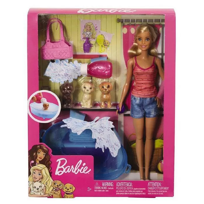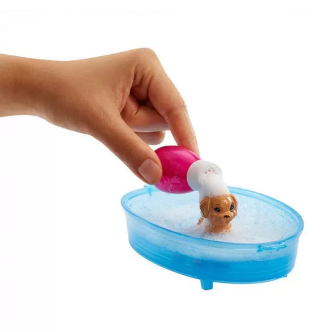 ā- The set includes BarbieĀ® doll wearing a swimsuit, her puppy, a bathtub, a spa frame, 5 packs of fizzy powder and accessories to help play out a relaxing bath.