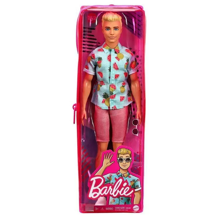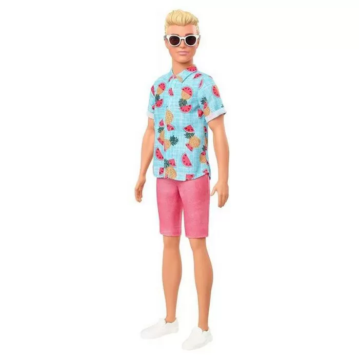 ​- Ken doll wears a tropical fruit-print shirt and coral shorts.