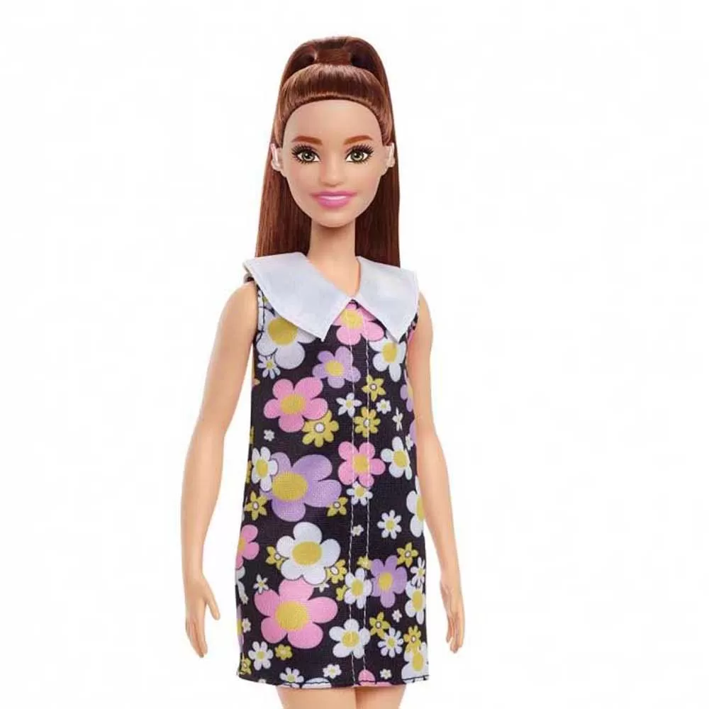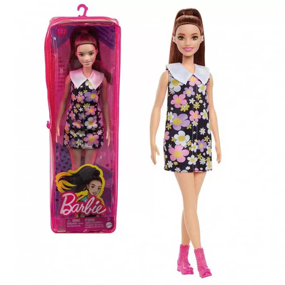 – Barbie® Doll Has A Smaller Bust And Wears A Daisy Print Shift Dress Featuring An Oversized Collar. Pink Boots Finish The Playful Yet Modern Look.