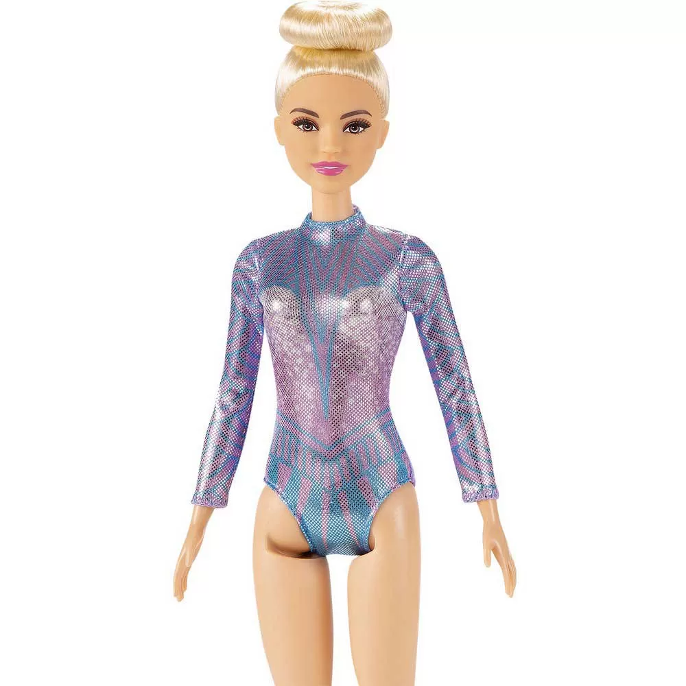 Explore a world of gymnastic fun with the Barbie® rhythmic gymnast doll! When a girl plays with Barbie®, she imagines everything she can become, and if you love gymnastics and dance, you can be a rhythmic gymnast! The Barbie® rhythmic gymnast doll (12-in/30.40-cm) wears a colorful metallic leotard and has a cute bun updo.