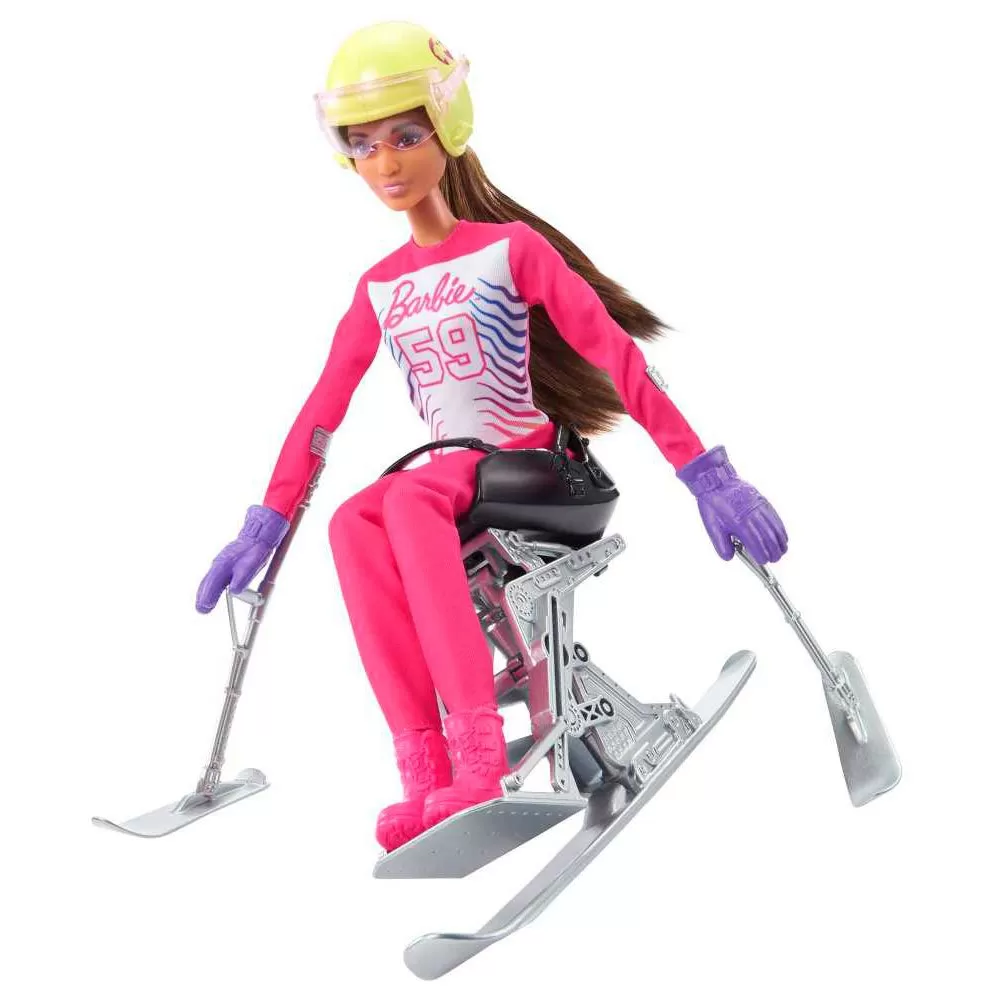 – Barbie® winter sports sit skier doll (12 inches) with outfit, gloves, helmet, outrigger skis, sit ski and medal.