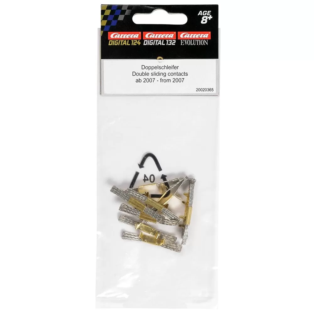 – What real racing drivers need are, of course, the double sliding contacts. One of the few wear parts in Carrera vehicles are the double sliding contacts. After countless laps, the double sliding contacts are worn out and the cars may slow down. Now is the time for some new double sliding contacts to keep up with your friends again. The set includes 10 double sliding contacts, which can be installed in all Exclusiv vehicles from 2006, EVOLUTION vehicles from 2007 and all DIGITAL 124/132 vehicles. You should always have a set of double sliding contacts ready in your own ´´Carrera workshop´´. Because a good driver is distinguished by good equipment – to always keep the car in a good condition!
