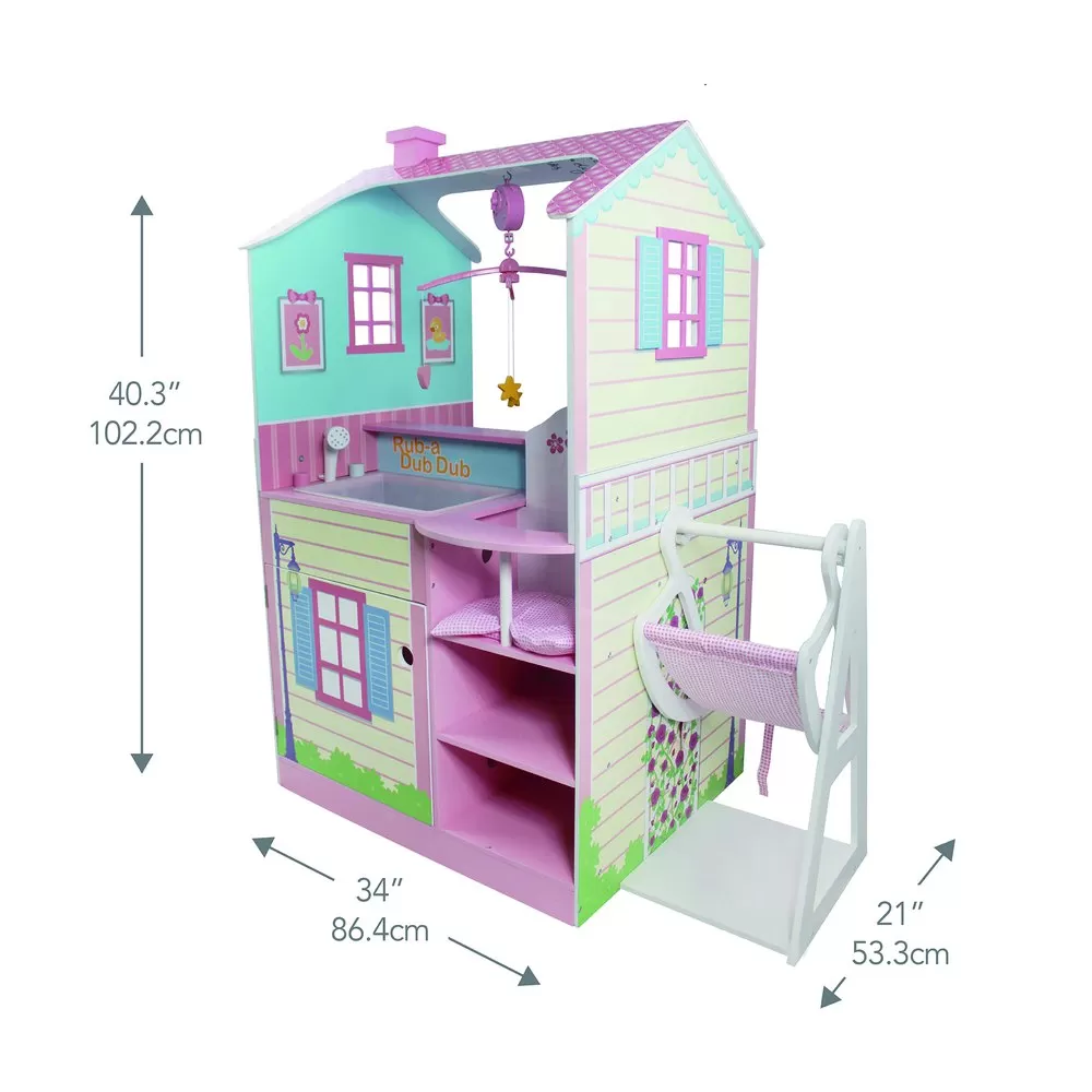Our doll house style baby doll changing station is the perfect place for your little one to tend to all their dolls changing needs. Constructed with high-quality durable wood, this baby doll nursery playset comes complete a changing table, baby doll storage shelves, highchair, baby cot, two pull-out storage bins, baby bathtub and rotating heart mobile, all in one piece of furniture.