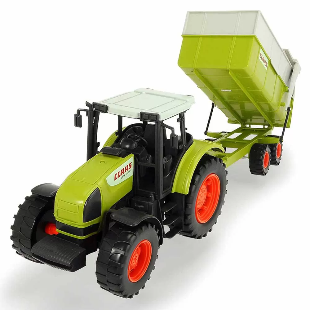 The Dickie Toys Farm Tractor helps aspiring farmers to get off to a flying start in the playroom. The tractor is faithfully modelled on the Claas design. Moving parts offer lots of scope for play, at the same time as encouraging the motor skills of farmyard fans of all ages. The tipping trailer makes loading and unloading quick and easy, just like proper jobs on a farm. The toy from the Farm range makes a perfect gift idea.