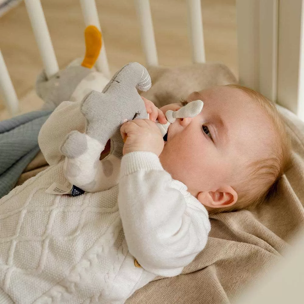 Motoric toy with rattle & „glow-in-the-dark“ embroidery – perfect companion for babies and toddlers 0+ The little ring grabber elephant from the Good Night collection can be taken everywhere and accompanies the baby while playing and dreaming in the cot, baby seat or stroller. In the evening, the “glow-in-the-dark” elements on the elephant take away the baby´s fear of the dark and convey a sense of security. During the day, the cuddly elephant playfully stimulates baby´s senses. It encourages the baby to grab, touch, discover and play with gentle rattling noises. Perfect for at home & on the go.