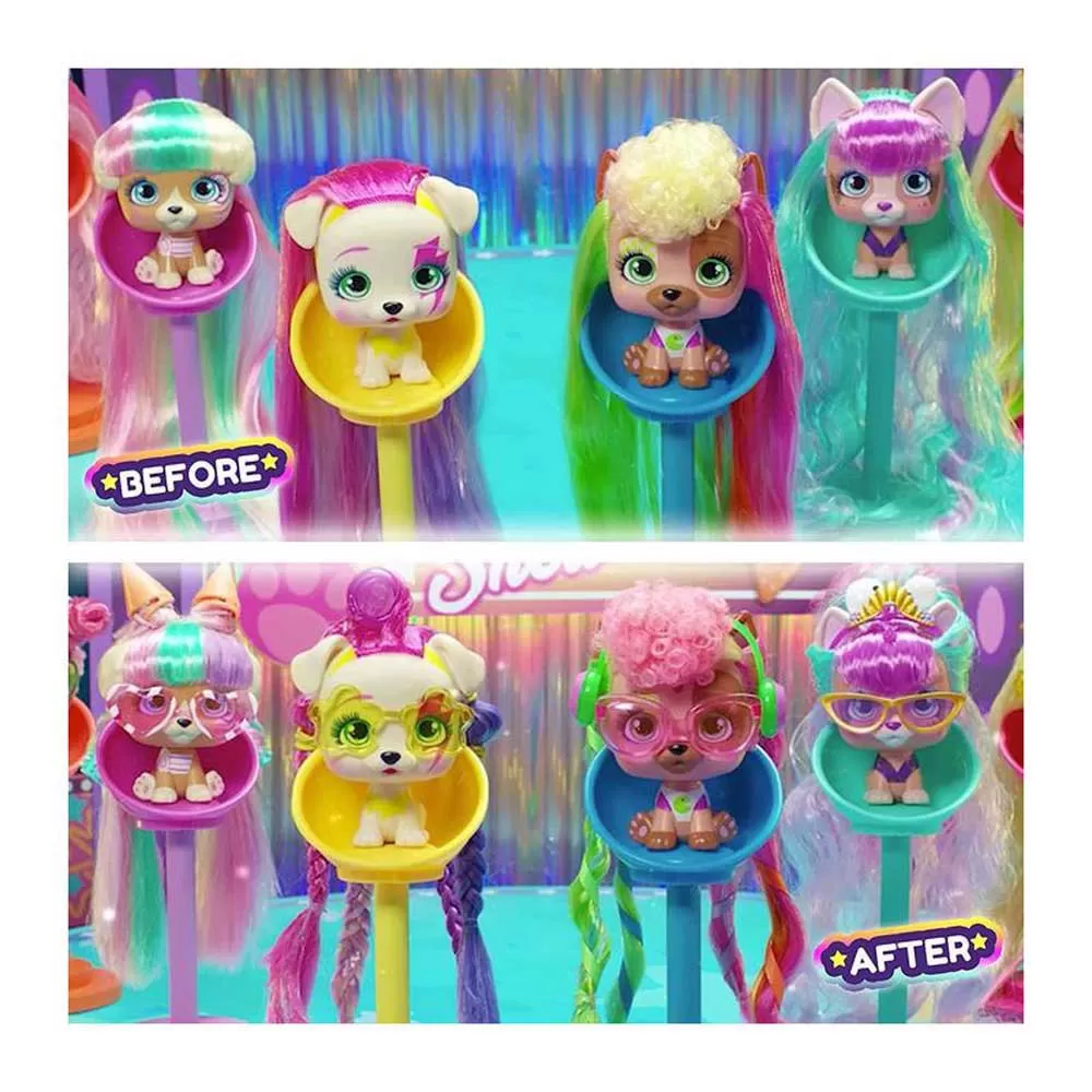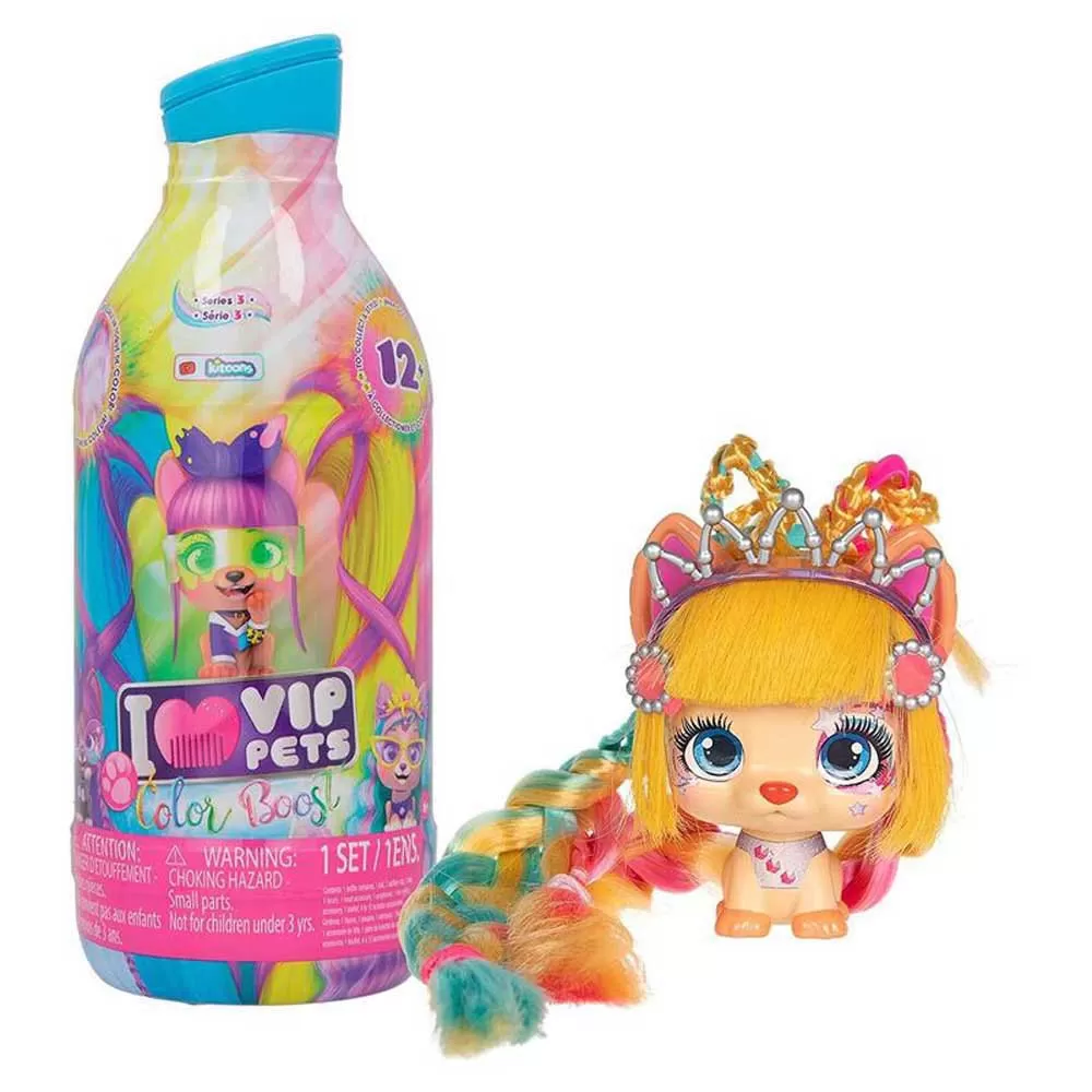 Vip Pets Color Boost series with a collection of 12+ new dolls! Each doll includes 9 surprises to unbox and 6 different accessories. All of them include a different color accessory to dye their 30 cm hair. They come in a new shampoo pack covered by an iridiscent courtain as in the Talent Show! Turn the tap of your shampoo to discover the surprise character! A chair is also included to make styling the doll easier.