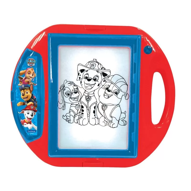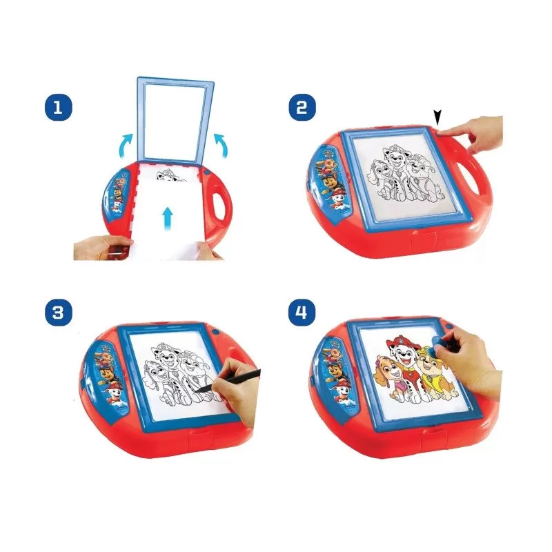 Drawing projector with A5 size screen, 10 drawing templates inspired by the adventures of Paw Patrol, to learn to draw and have fun at the same time, easy to use thanks to its illuminated screen and easy operation, you can store all its accessories in its interior to take it anywhere Easy to use for the little ones, you must place the template under the plastic cover, place a sheet of paper on the cover, close well and start the artistic creation 10 templates included Included in the box 1 projector, 10 templates, 4 ink stamps, 1 pencil and 10 sheets of paper and of course the manual with all its instructions Dimensions 30.5 x 26.5 x5.5 cm
