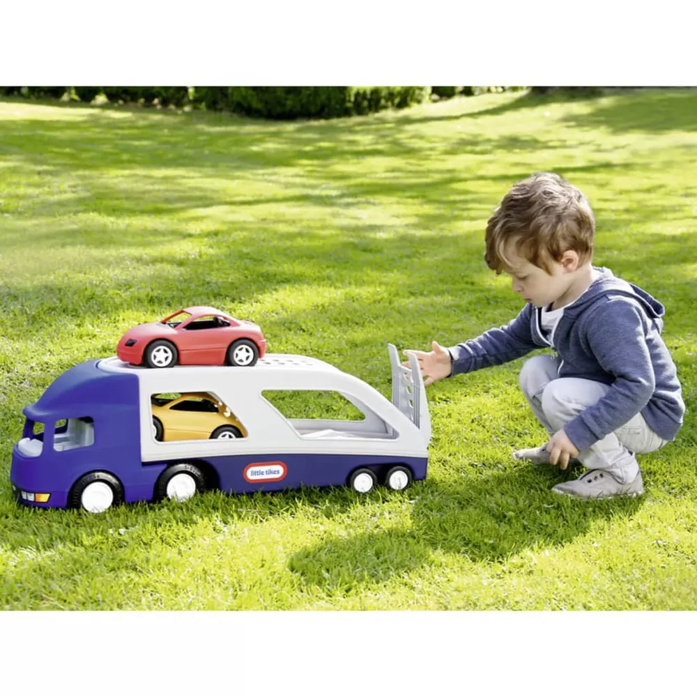 The big car carrier comes with two toy sports cars and a ramp that is easy to flip down. To create more game possibilities, one car can fit on the top and the truck can be uncoupled from the hauler.