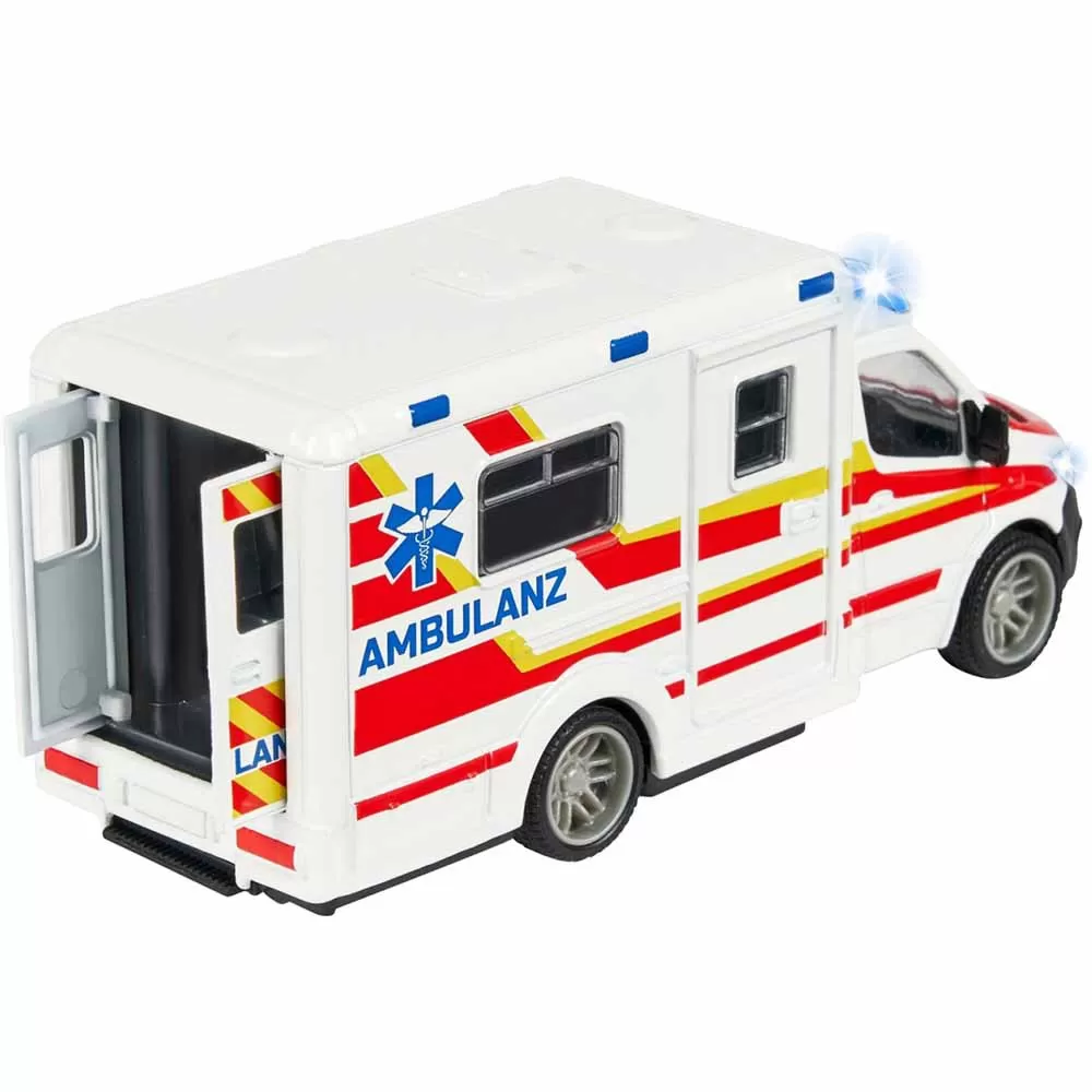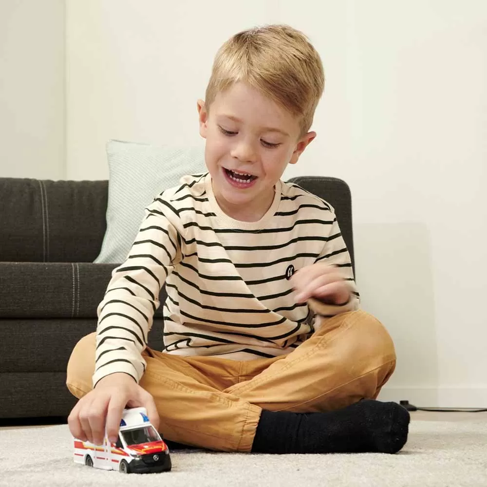 – Off to the rescue – The ambulance is an officially licensed model from Mercedes-Benz and comes with headlights, warning lights and sound effects