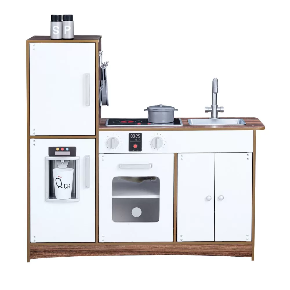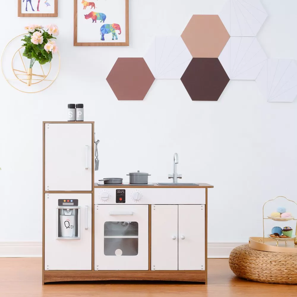Give your little ones a kitchen of their own with the Teamson Kids Little Chef Palm Springs Classic Kids Play Kitchen with 6 Accessories. This retro-style play kitchen is designed with a natural wood finish and white accents, making it great for both boys and girls, and it completes any home, classroom, preschool, or daycare playroom. The functional and interactive design features openable oven doors, a refrigerator, 2 turning oven knobs, 2 induction burners that make realistic cooking noises and glow red, an ice maker, a sink, and an under-sink cabinet to enhance your little one´s play time. With 10 included accessories – a pan, pot, 2 spatulas, 2 spice bottles, 3 plastic ice cube, and a cup included– this toddler kitchen encourages role play and lights up your little chef’s imagination and creativity. The durable and eco-friendly construction is kid-safe and easy to wipe clean with a damp cloth for every day messes. The easy-to-follow instructions allow for quick adult assembly so play time can start right away. This kid-sized toy kitchen has a compact size and is recommended for children ages 3 years and up. Induction cooker requires 2 1.5V AA/LR6 batteries (not included). Take innovative design and functionality to the next level with Teamson Kids play kitchens. Choose from kitchens that offer a fantasy feel or kitchens that resemble mum’s very own! Whichever you like, we offer something for your exceptional taste. Made from sturdy high quality wood, our kitchens are built to last through all of the feasts they wish to make!