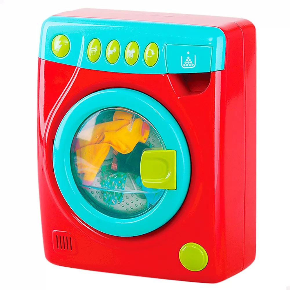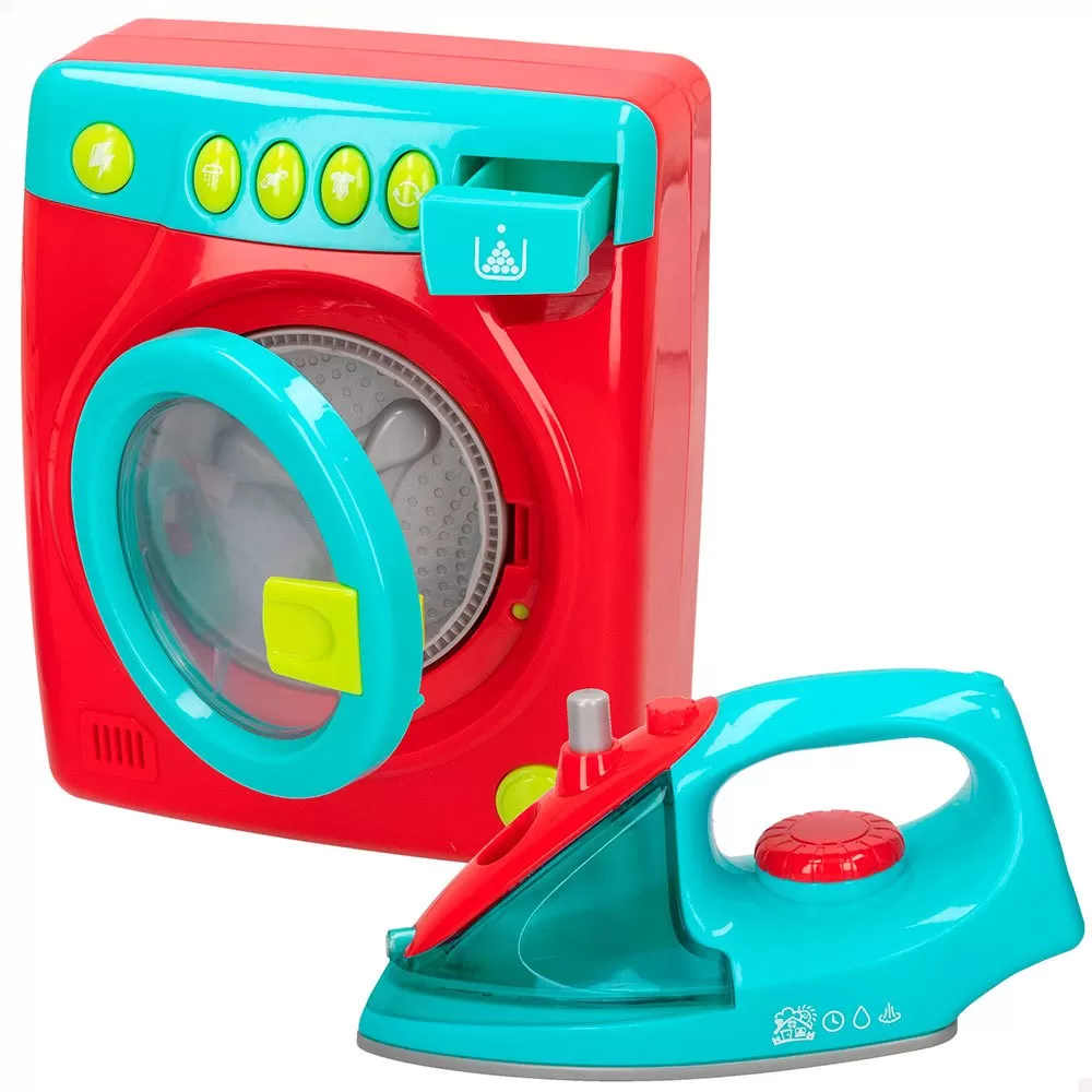 Your little one will learn and have fun with PlayGo! The washing machine has a hinged door, the drum rotates, the detergent drawer opens, sounds and lights up by pressing 4 buttons to choose the washThe iron has a removable compartment that fills with water and releases steamIt works with 4 AA batteries and 2 AA batteries (not included)Recommended for 3 years, reproduces the imitation of roles.