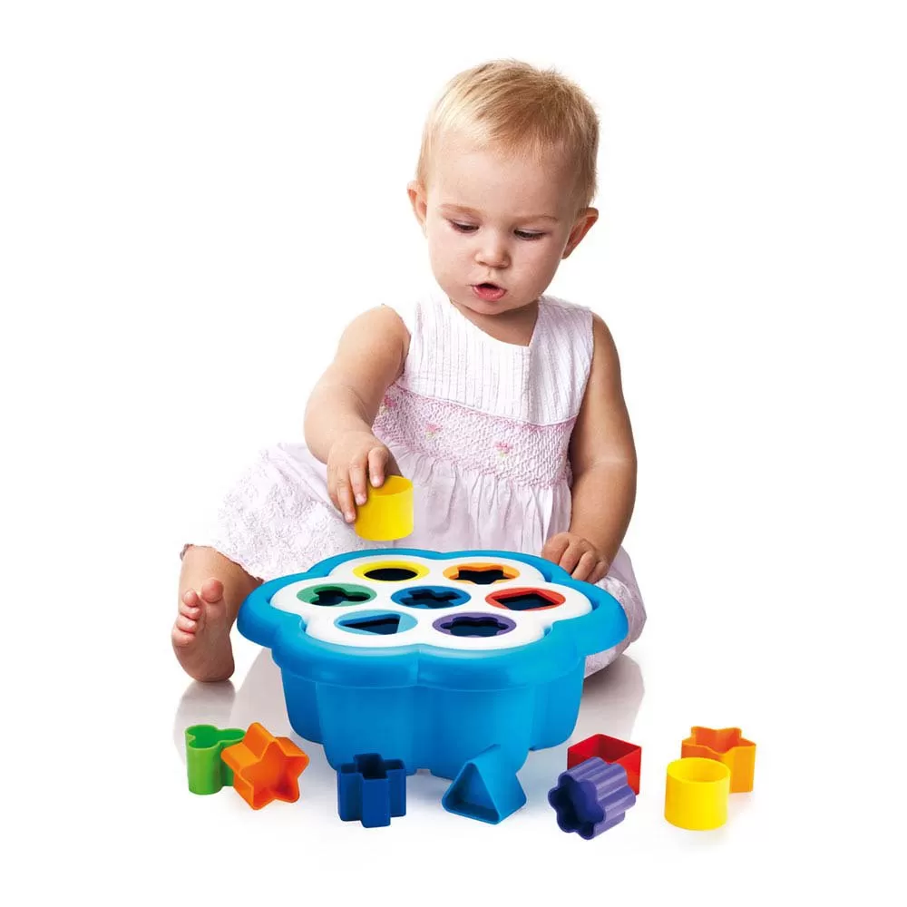 It has a daisy-shaped base with seven holes of different sizes and colours, so that the child learns to recognize and assign the corresponding blocks.