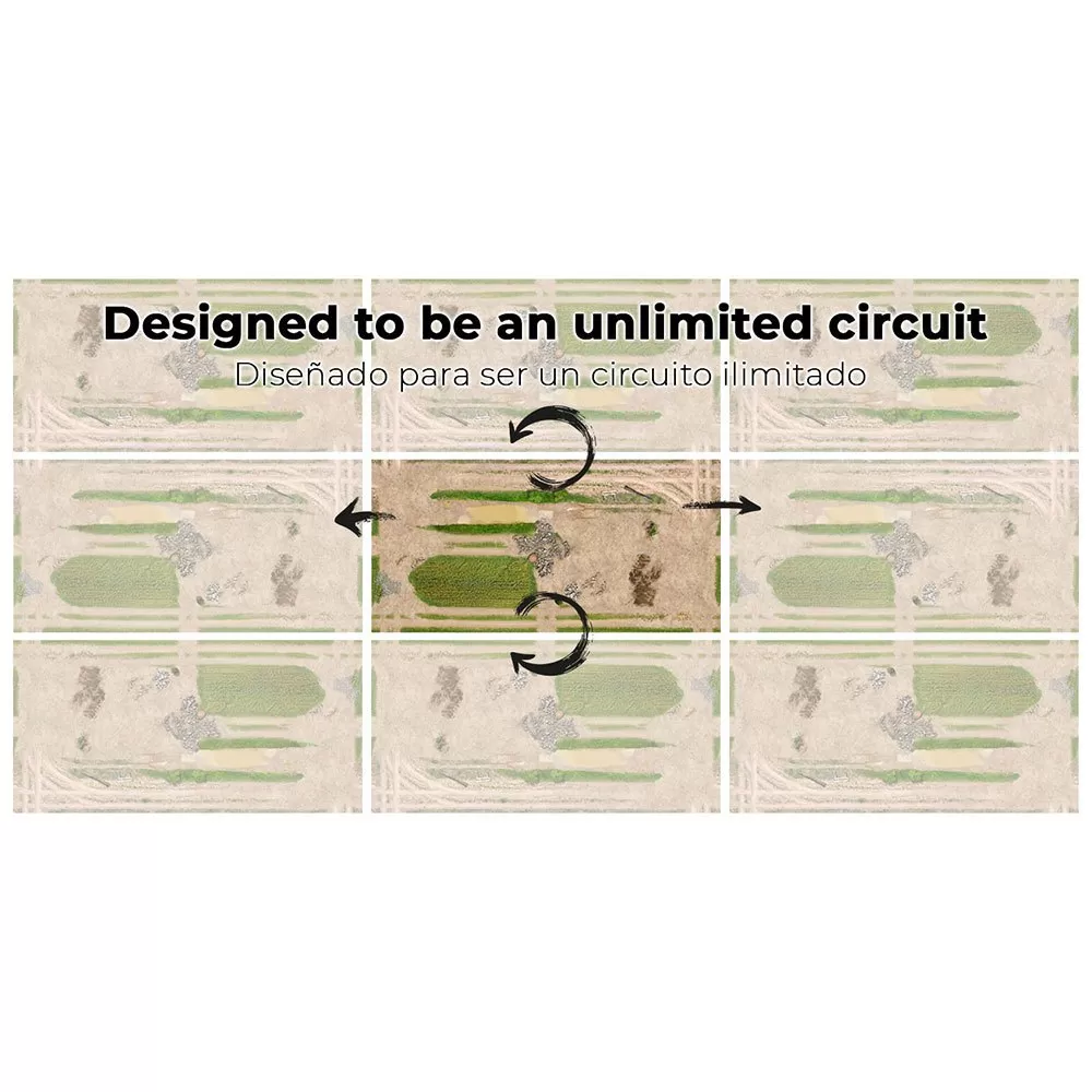 – You can join more identical carpets since we have designed the joints so that the paths coincide and you can expand your circuit without limit. For example, with 3 carpets you will have a 4 square meter circuit, with a rectangular format of 82x79in or a long format of 28x237in, perfect for Crawler Challenge races.