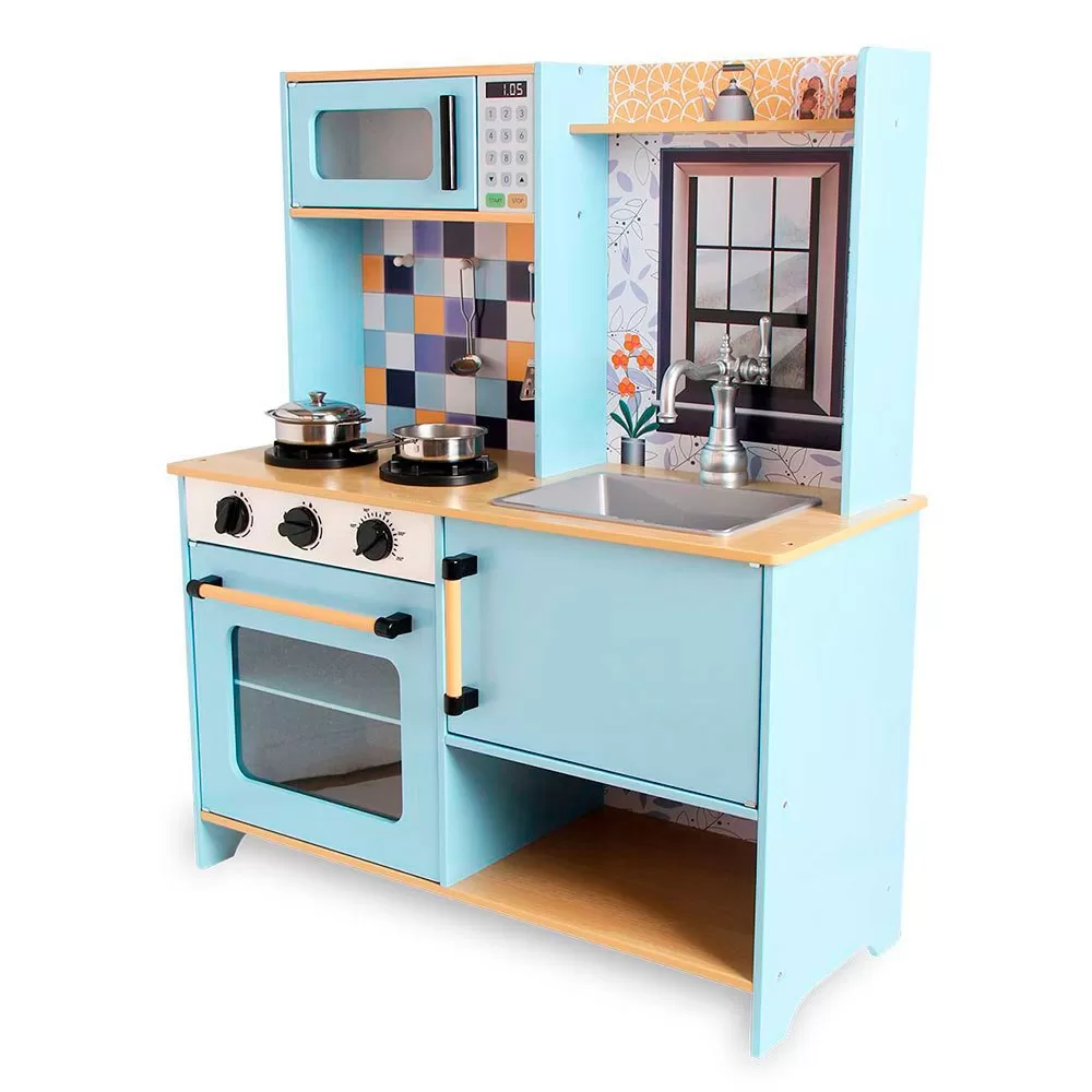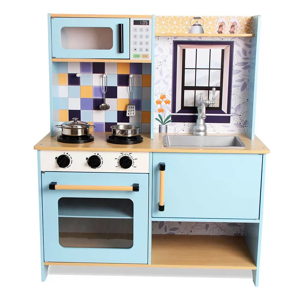 It contains sink, microwave, oven, 4 metal utensils, etc.
